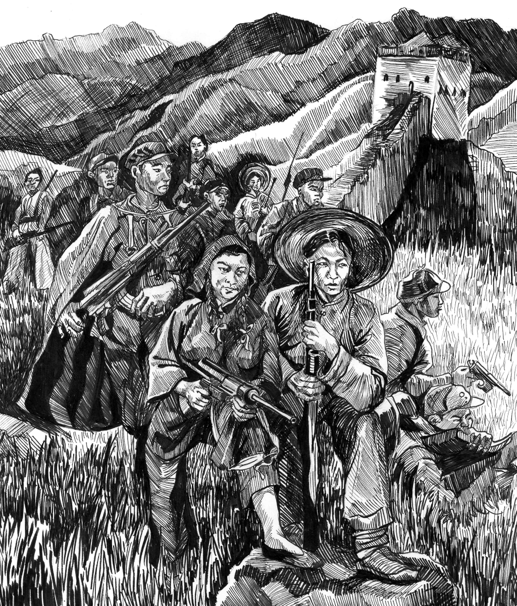 One of the most dramatic episodes of the Long March occurred at Luding Bridge in May 1935. Pursued by GMD forces and on the brink of destruction, a Red Army battalion was ordered to storm the suspension bridge under heavy machine-gun fire. The bridge’s chains had been stripped of planks, forcing the soldiers to crawl forward hand over hand while comrades laid new boards behind them. Against all odds, they seized the bridge, opening the path for the rest of the army to cross.